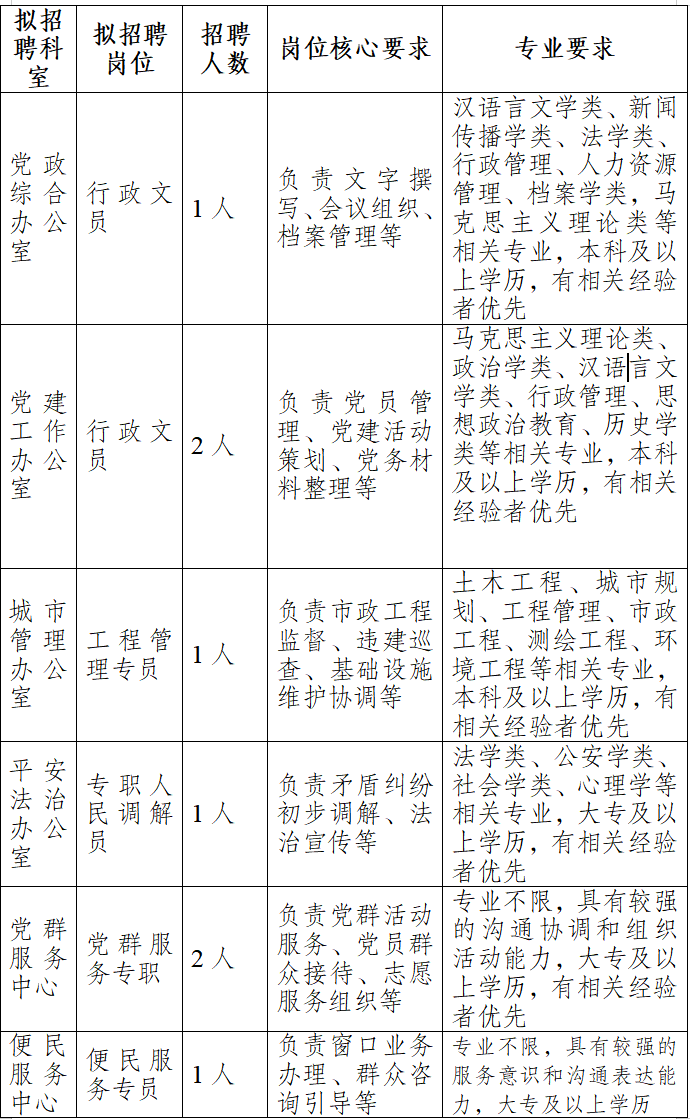 综合素质:热爱社区工作,有较强的责任心和团队合作精神,具备良好的沟通协调和文字表达能力。无违法违纪记录,符合岗位要求的其他资格条件。