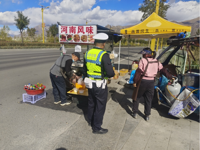 为有效规范西藏技师学院周边市容秩序,消除道路交通安全隐患,10月24日,柳梧公安分局交警大队携手热玛岗街道社区工作者、城管执法部门以及热玛岗街道警务站,在技师学院门口开展“流动商贩”联合整治行动。